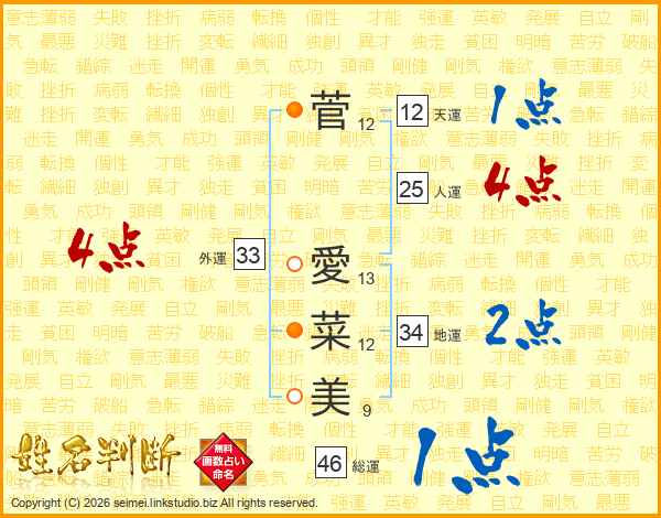 菅(12画) 愛(13画)菜(12画)美(9画)