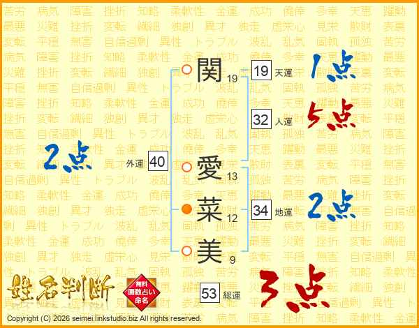 生活面を象徴する運勢です。外部から受ける影響力を表し、結婚運、家庭運や職場、環境への順応性を表します。総運から人運を引いた画数。姓や名が1文字の場合を除く。