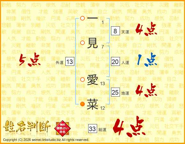 生活面を象徴する運勢です。外部から受ける影響力を表し、結婚運、家庭運や職場、環境への順応性を表します。総運から人運を引いた画数。姓や名が1文字の場合を除く。