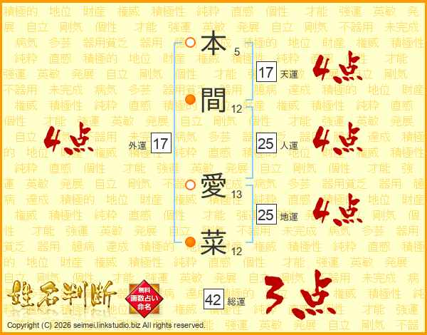 生活面を象徴する運勢です。外部から受ける影響力を表し、結婚運、家庭運や職場、環境への順応性を表します。総運から人運を引いた画数。姓や名が1文字の場合を除く。