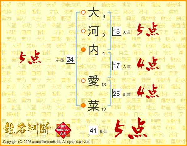 大(3画)河(9画)内(4画) 愛(13画)菜(12画)
