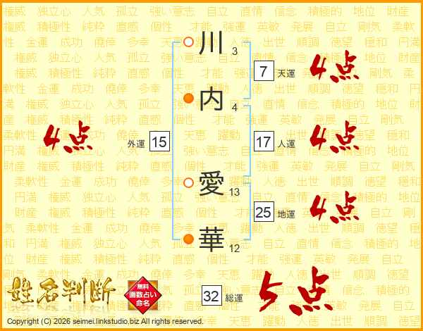 生活面を象徴する運勢です。外部から受ける影響力を表し、結婚運、家庭運や職場、環境への順応性を表します。総運から人運を引いた画数。姓や名が1文字の場合を除く。