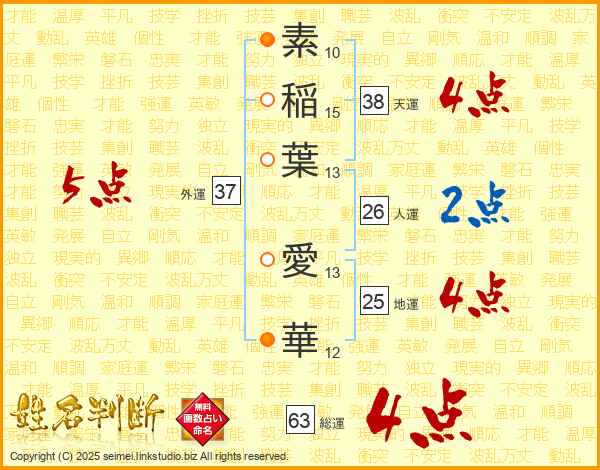 素(10画)稲(15画)葉(13画) 愛(13画)華(12画)