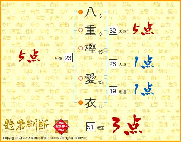 八(8画)重(9画)樫(15画) 愛(13画)衣(6画)