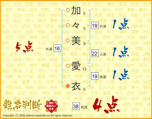 加々美愛衣さんの総運は38画の4点!