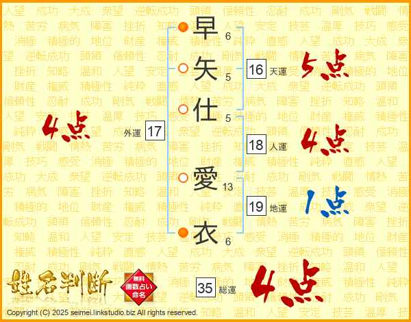 生活面を象徴する運勢です。外部から受ける影響力を表し、結婚運、家庭運や職場、環境への順応性を表します。総運から人運を引いた画数。姓や名が1文字の場合を除く。
