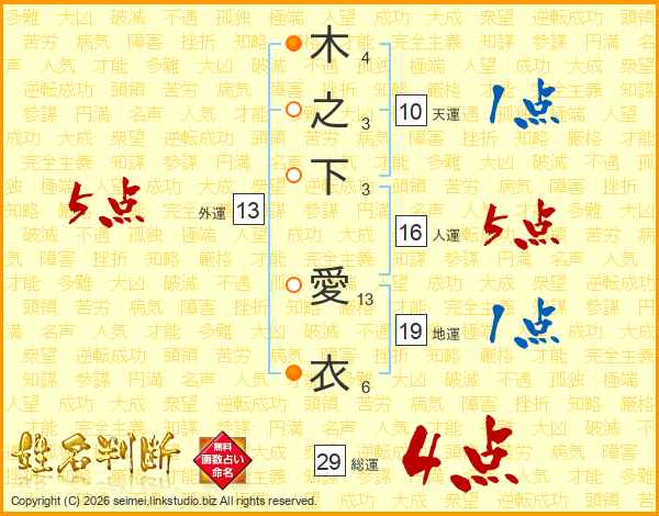 木(4画)之(3画)下(3画) 愛(13画)衣(6画)