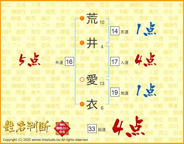 荒(10画)井(4画) 愛(13画)衣(6画)