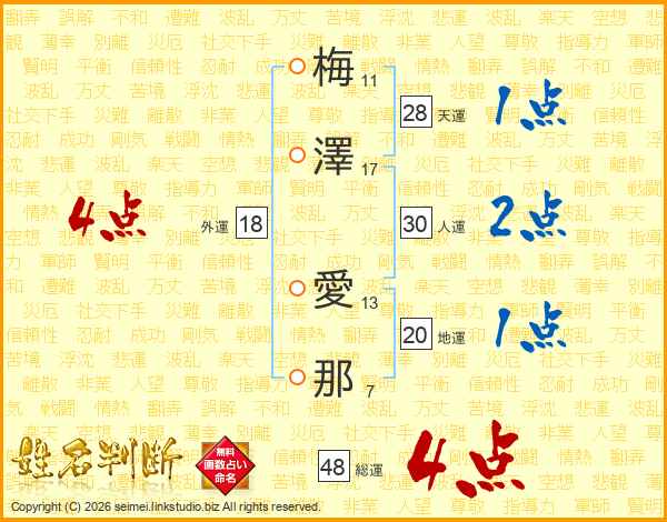 梅(11画)澤(17画) 愛(13画)那(7画)