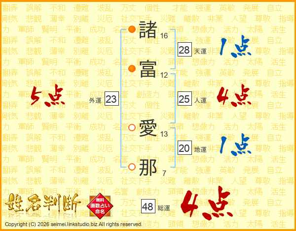 諸(16画)富(12画) 愛(13画)那(7画)