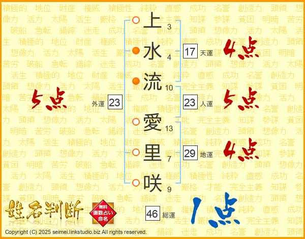 上(3画)水(4画)流(10画) 愛(13画)里(7画)咲(9画)