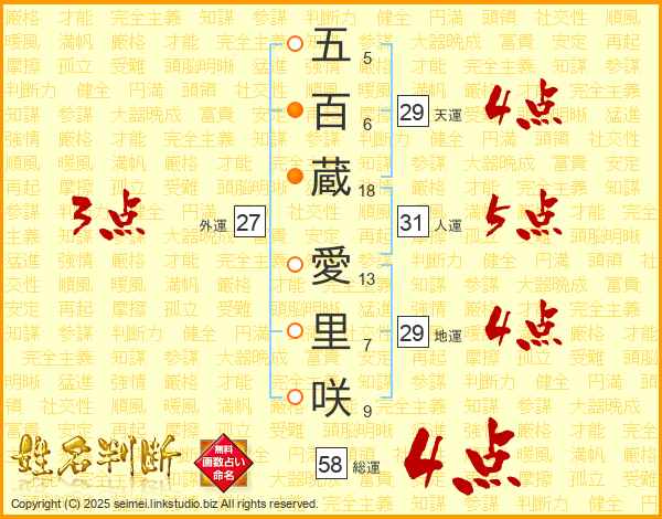 五(5画)百(6画)蔵(18画) 愛(13画)里(7画)咲(9画)