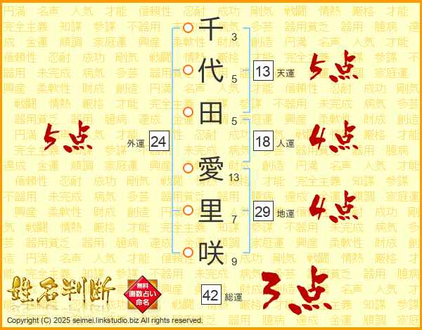 千(3画)代(5画)田(5画) 愛(13画)里(7画)咲(9画)