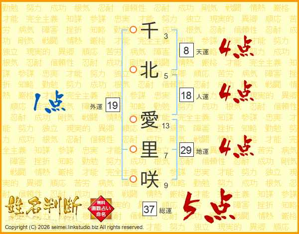 千(3画)北(5画) 愛(13画)里(7画)咲(9画)