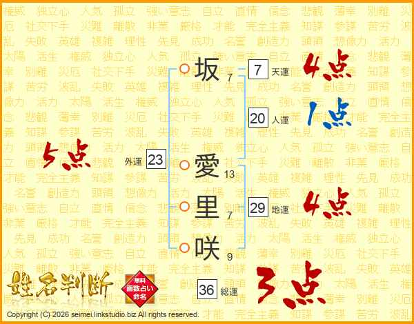坂(7画) 愛(13画)里(7画)咲(9画)