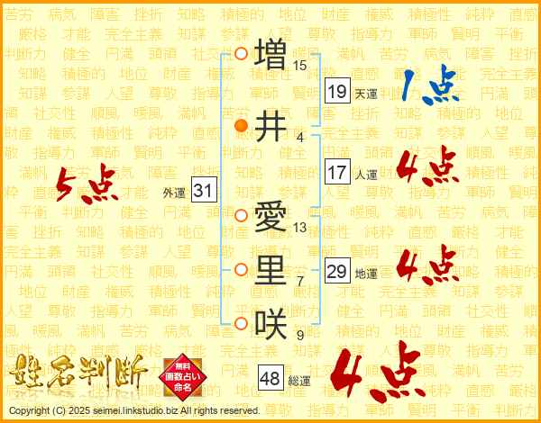 増(15画)井(4画) 愛(13画)里(7画)咲(9画)