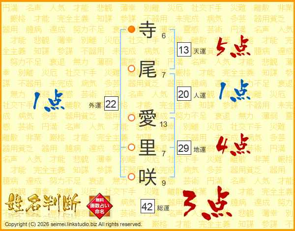 寺(6画)尾(7画) 愛(13画)里(7画)咲(9画)