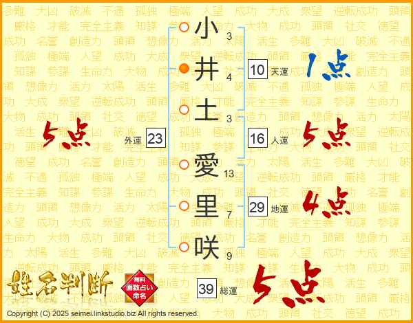 小(3画)井(4画)土(3画) 愛(13画)里(7画)咲(9画)