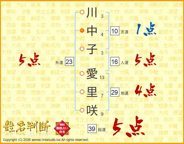 川(3画)中(4画)子(3画) 愛(13画)里(7画)咲(9画)