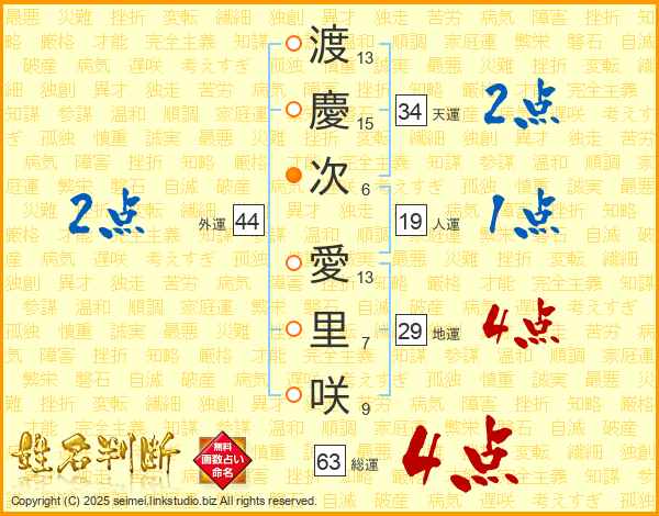 渡(13画)慶(15画)次(6画) 愛(13画)里(7画)咲(9画)