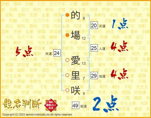 的(8画)場(12画) 愛(13画)里(7画)咲(9画)