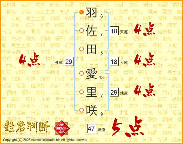 羽(6画)佐(7画)田(5画) 愛(13画)里(7画)咲(9画)