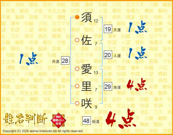 須(12画)佐(7画) 愛(13画)里(7画)咲(9画)