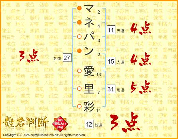 マ(2画)ネ(4画)パ(3画)ン(2画) 愛(13画)里(7画)彩(11画)