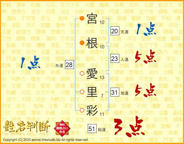 宮(10画)根(10画) 愛(13画)里(7画)彩(11画)