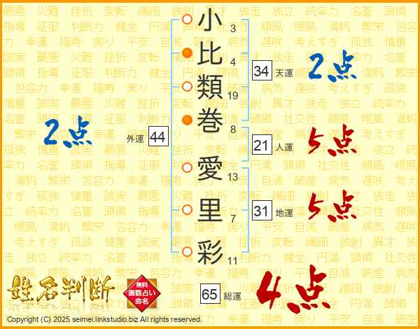 小(3画)比(4画)類(19画)巻(8画) 愛(13画)里(7画)彩(11画)