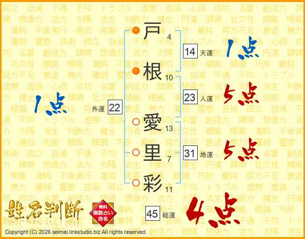 戸根愛里彩さんの総運は45画の4点!
