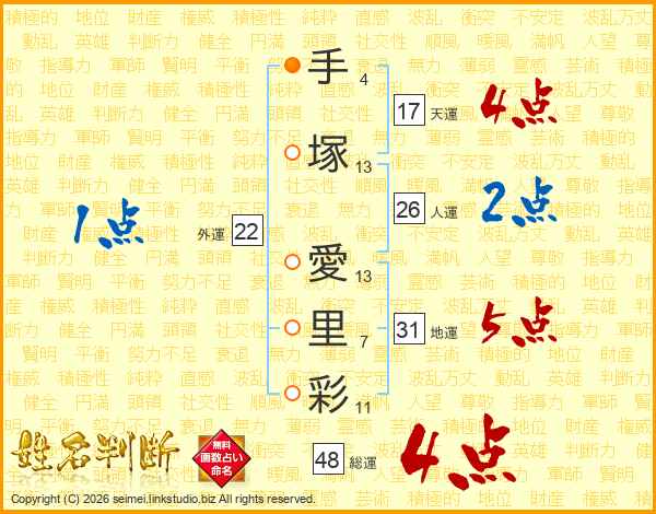 手(4画)塚(13画) 愛(13画)里(7画)彩(11画)