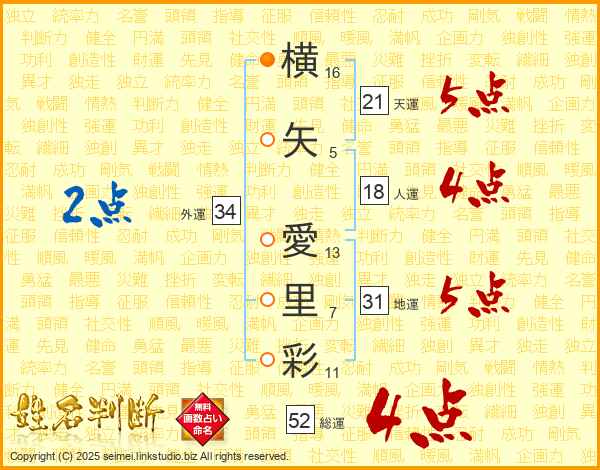 横(16画)矢(5画) 愛(13画)里(7画)彩(11画)
