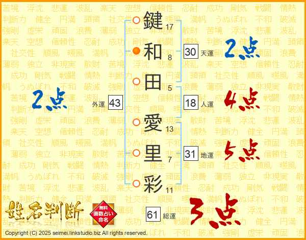鍵(17画)和(8画)田(5画) 愛(13画)里(7画)彩(11画)