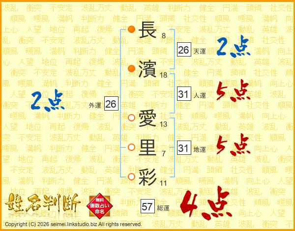 長(8画)濱(18画) 愛(13画)里(7画)彩(11画)