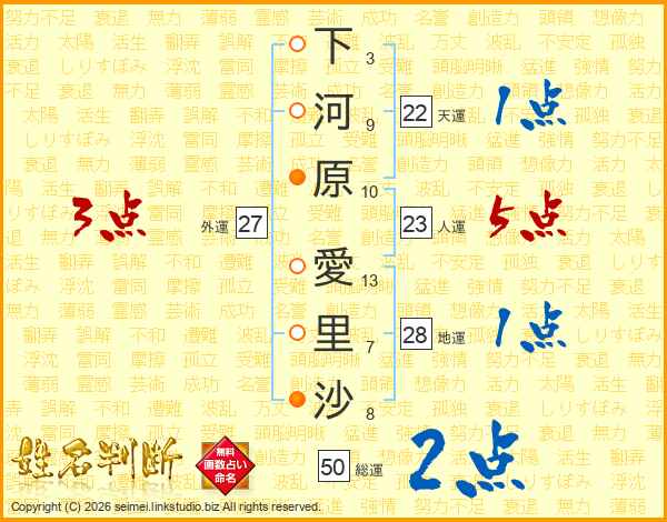 下(3画)河(9画)原(10画) 愛(13画)里(7画)沙(8画)