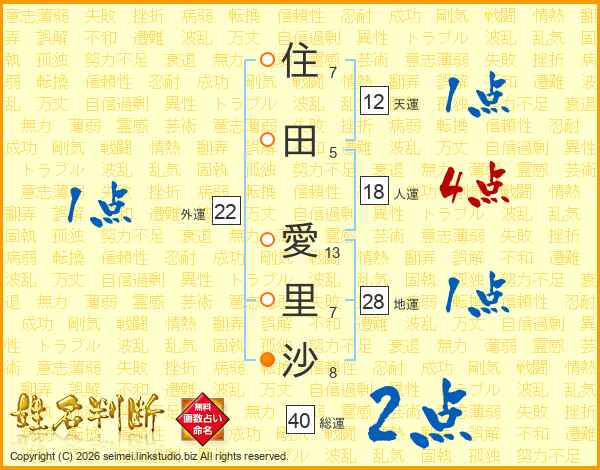 住(7画)田(5画) 愛(13画)里(7画)沙(8画)