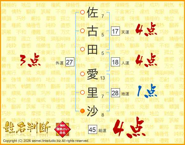佐(7画)古(5画)田(5画) 愛(13画)里(7画)沙(8画)