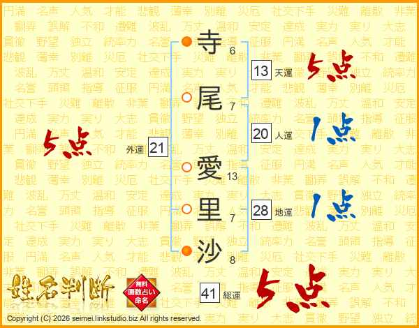 寺(6画)尾(7画) 愛(13画)里(7画)沙(8画)