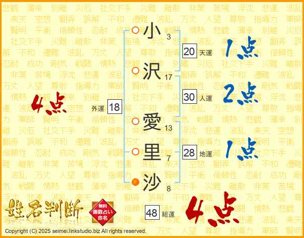 小(3画)沢(17画) 愛(13画)里(7画)沙(8画)