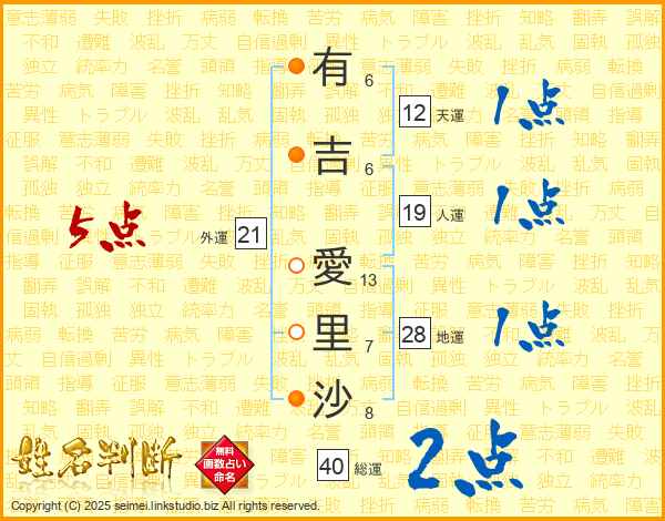 有(6画)吉(6画) 愛(13画)里(7画)沙(8画)