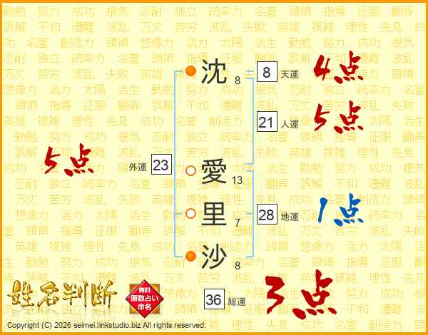 沈(8画) 愛(13画)里(7画)沙(8画)