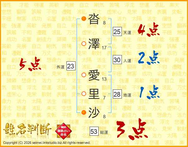 沓(8画)澤(17画) 愛(13画)里(7画)沙(8画)