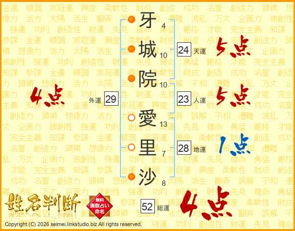 牙城院愛里沙さんの総運は52画の4点!