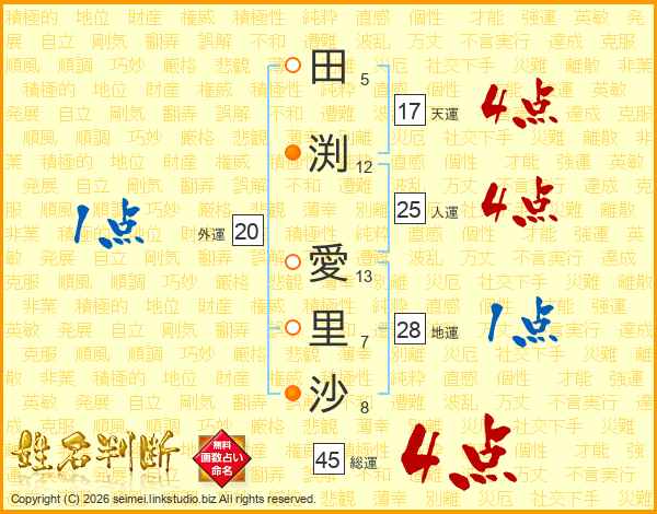 田(5画)渕(12画) 愛(13画)里(7画)沙(8画)