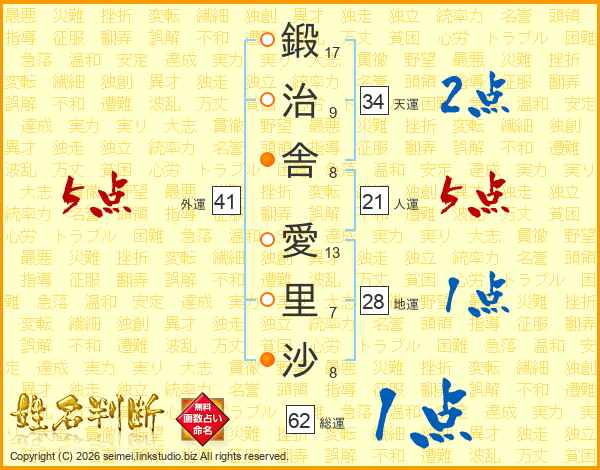 鍛(17画)治(9画)舎(8画) 愛(13画)里(7画)沙(8画)