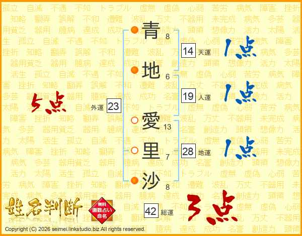 青(8画)地(6画) 愛(13画)里(7画)沙(8画)