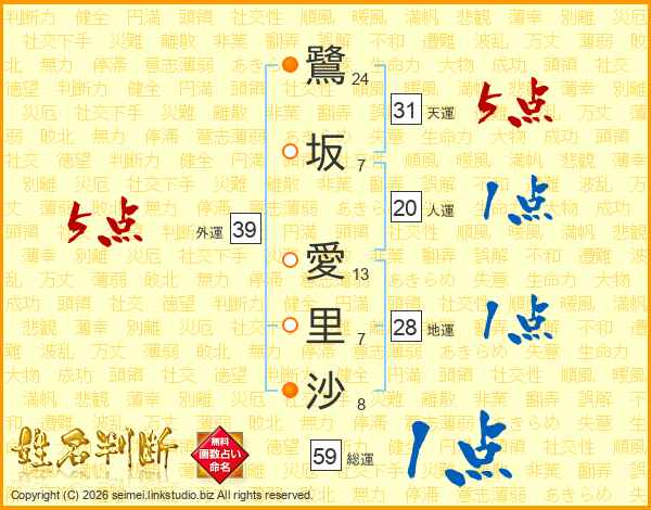 鷺(24画)坂(7画) 愛(13画)里(7画)沙(8画)