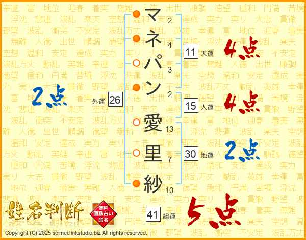 マ(2画)ネ(4画)パ(3画)ン(2画) 愛(13画)里(7画)紗(10画)