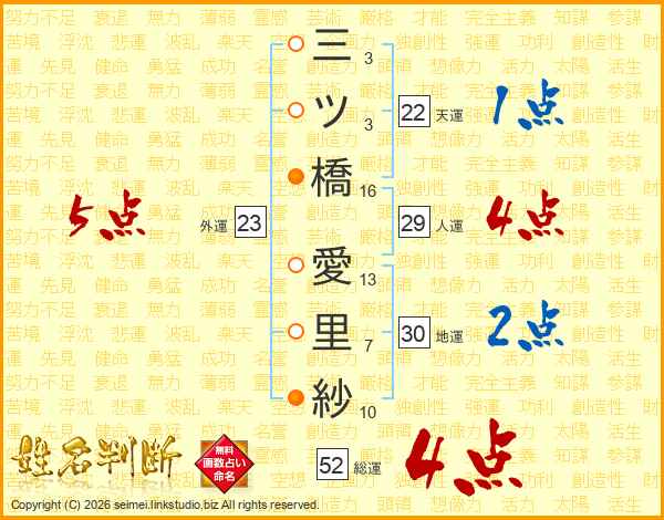 三ツ橋愛里紗さんの総運は52画の4点!